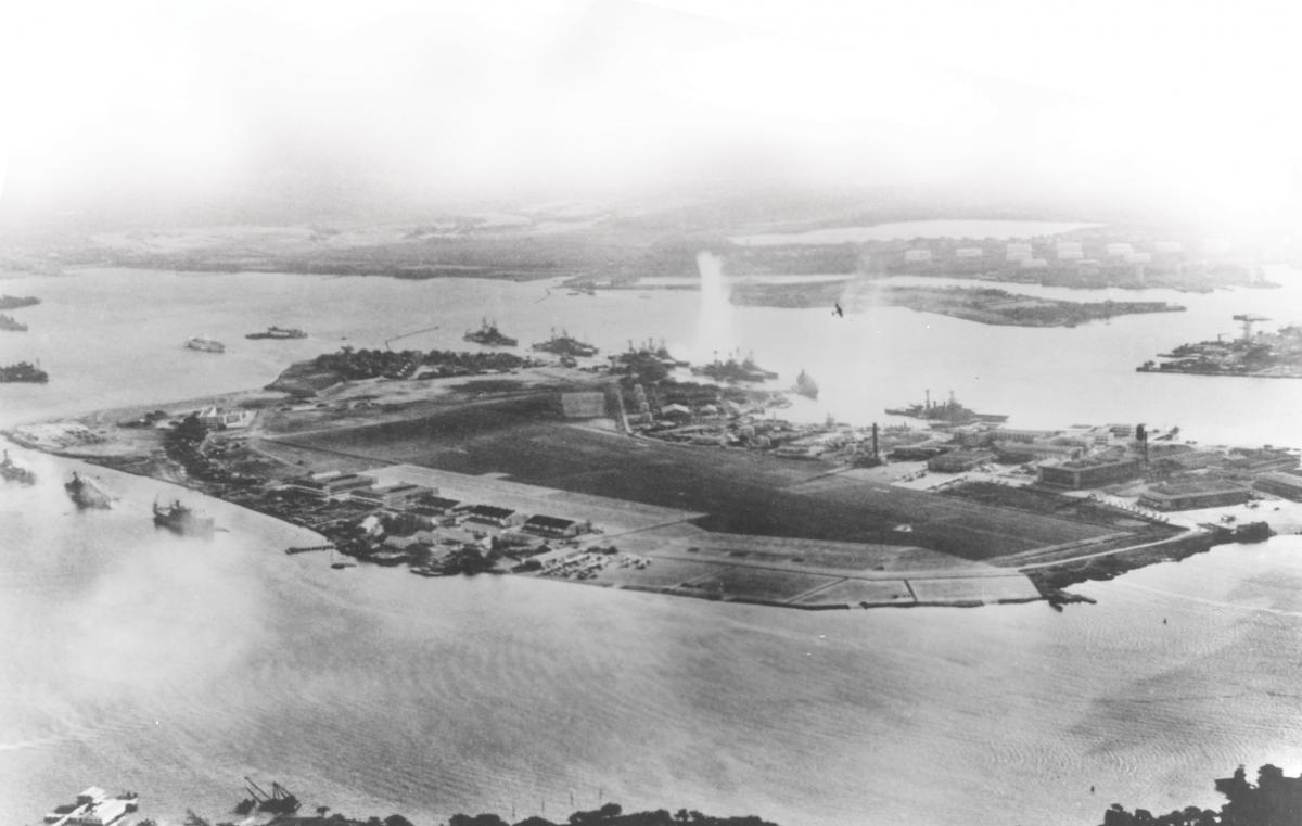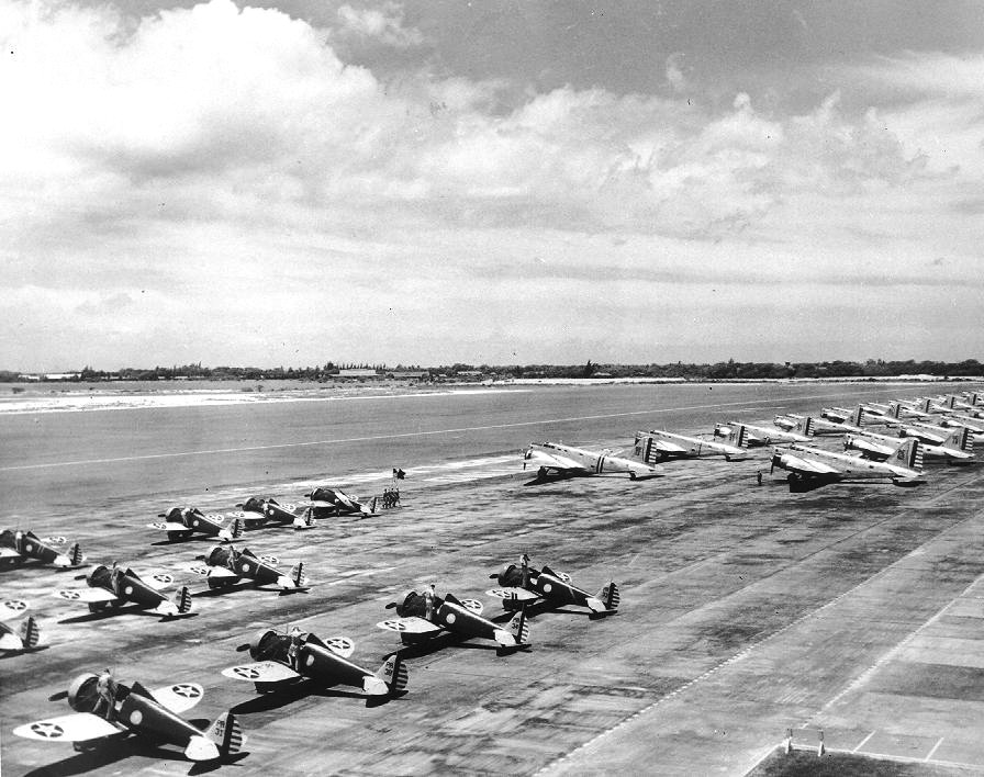 Twenty miles up the central valley of Oahu he could see the Army air base and Wheeler airfield. Thirty-five miles beyond, and clearly visible from this altitude, were the three lobes of the naval base at Pearl Harbor. No American planes moved in the sky. The American Pacific Battle Fleet remained chained to its anchors.