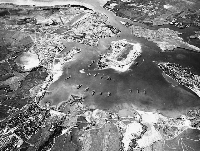 The lagoon's original name was “Wai Momi”; in English, "Waters of Pearl". Over the previous half century the U.S. Navy had dredged it to an average depth of 30 feet, built piers, dry docks, maintenance yards, barracks, warehouses and air fields.