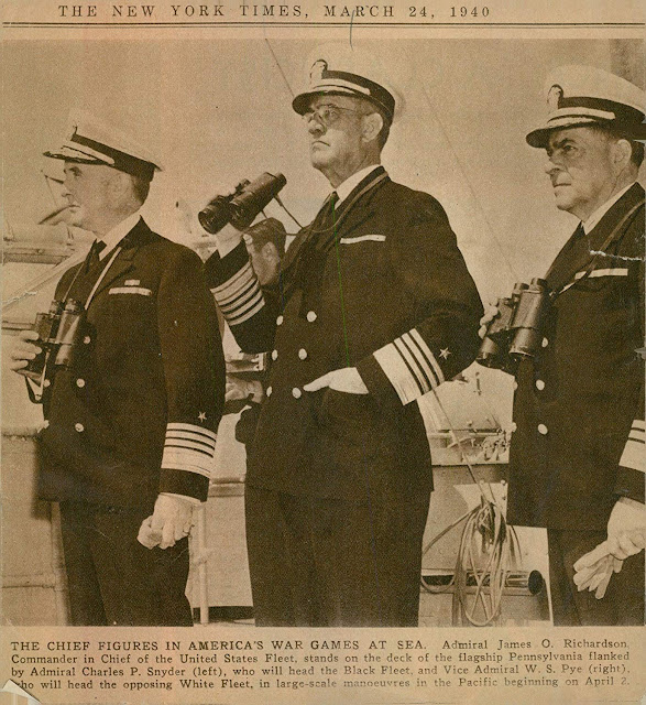 Oddly, the individual who objected the most to basing the fleet at Pearl Harbor was the Commander of the U.S. Pacific Fleet, 64 year old Admiral James Otto Richardson (above, center).