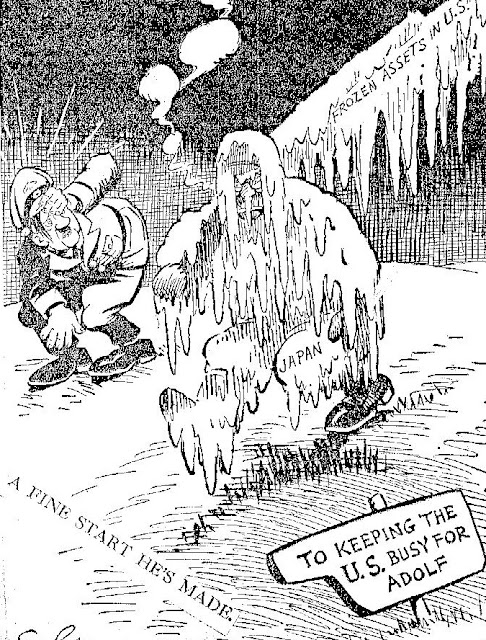 Then, early in July of 1941 the Japanese occupied the rubber plantations in French Indochina, gaining access to yet another vital war supply. Outraged, President Franklin Roosevelt froze all Japanese funds in American banks. The President and his senior advisers then secretly slipped off to Newfoundland to meet with Winston Churchill to talk about the war then raging in Europe.