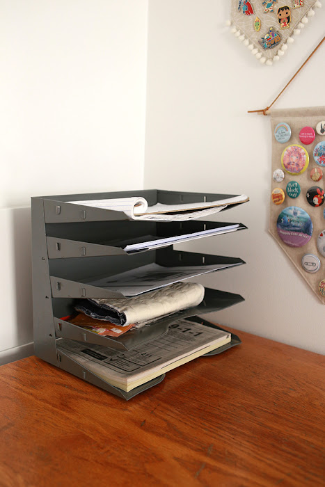 If you're storing your tools on your work table, a system for corralling them is key. Keep it simple with a few mason jars or baskets. Or make yourself a tool caddy. I've made a bunch of the #10 Caddy Pattern* by Sew Can She, they're fun!I struggle with keeping my various paperwork organized on my tabletop, so I recently added a metal letter organizer to help me out. It's a great spot to store small works in progress, patterns I want to make soon and a notebook. I was always piling up papers in that corner, so this feels neater.