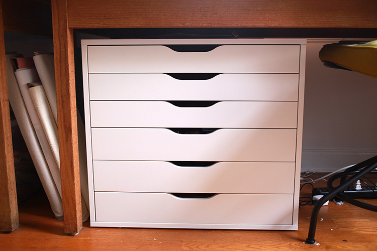 It goes without saying, but good project storage is key to keeping your worktable tidy. I keep the projects I'm currently working on in this cabinet that sits directly underneath my cutting table. Having storage within and arms reach of my machine and table means it's super easy to put things away and access other projects. Next week's post will be on WIP and UFO storage!